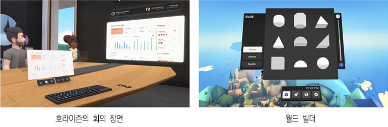 호라이즌 역시 월드 빌더(World Builder)라는 도구를 활용하여 가상의 환경을 만들 수 있으며, 가상현실 헤드셋을 활용하여 좀 더 자유롭고 몰입감 있는 환경에서 제작이 가능합니다.2019년 메타(구페이스북)는 오큘러스(Oculus) 컨퍼런스에서 호라이즌 월드라는 가상현실 세계를 발표하였습니다. 앞의 플랫폼들은 특별한 도구를 필요로 하지 않지만 호라이즌 월드는 가입하기 위해서는 오큘러스 VR 헤드셋이 필요합니다.