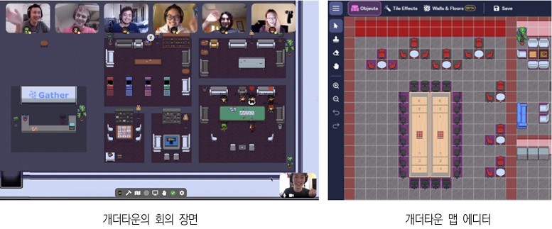 주로 비대면 재택근무 환경에서 가상 오피스를 구성하고, 회의와 협업을 위해 설계되었습니다. 개더타운의 차별화된 특징은 웹캠과 결합된 화상회의 기능으로, 사용자들은 현실감 있는 회의 경험을 제공받을 수 있습니다.