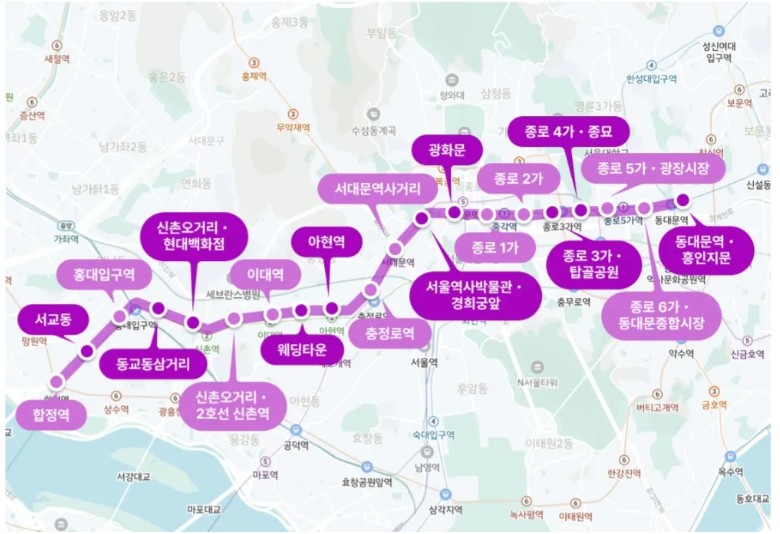 | 노선 | 흥인지문.동대문역 - 종로1~6가 - 광화문 - 서대문역 - 충정로역 - 아현역 - 이대역 - 신촌역 - 홍대입구역 - 합정역 |